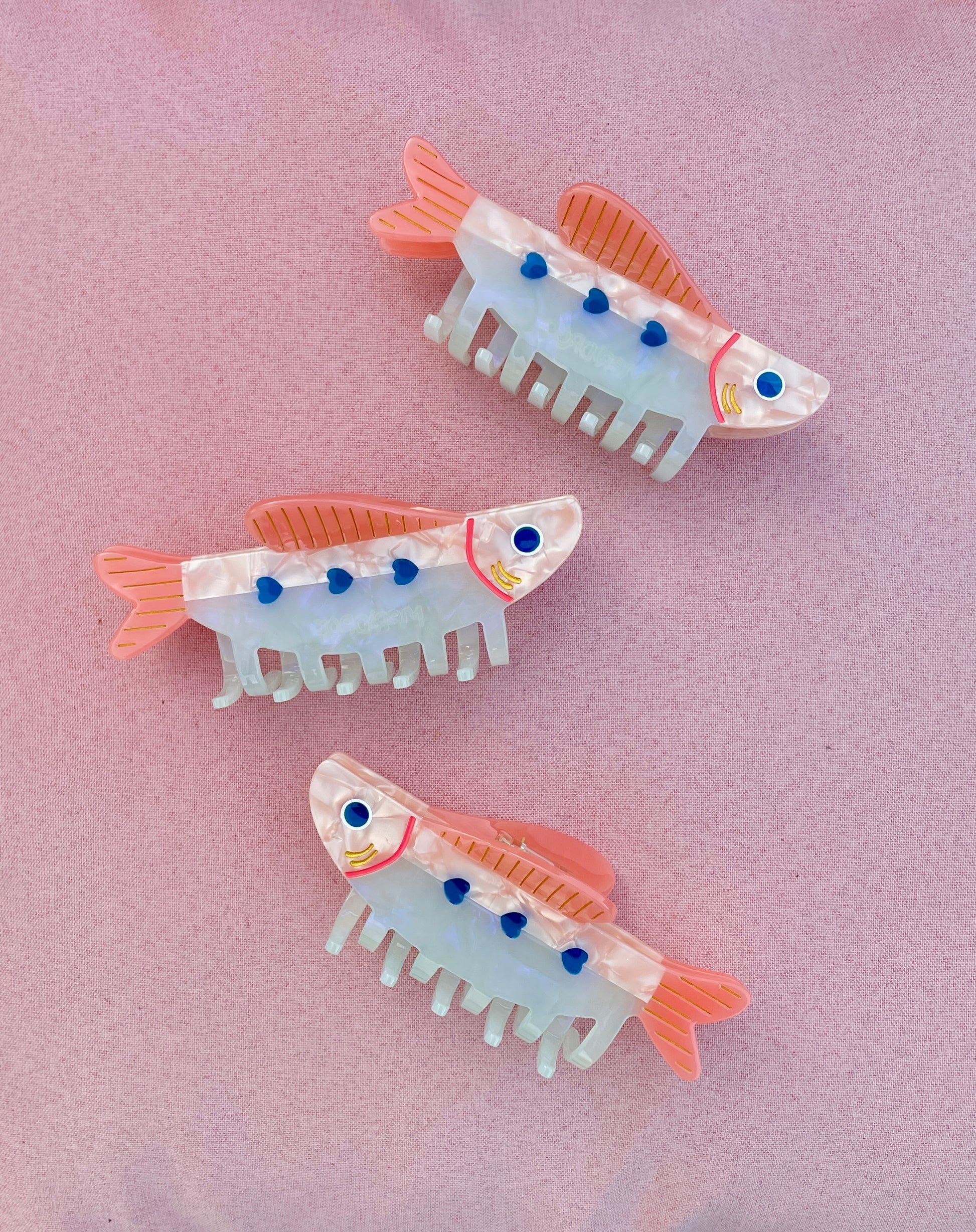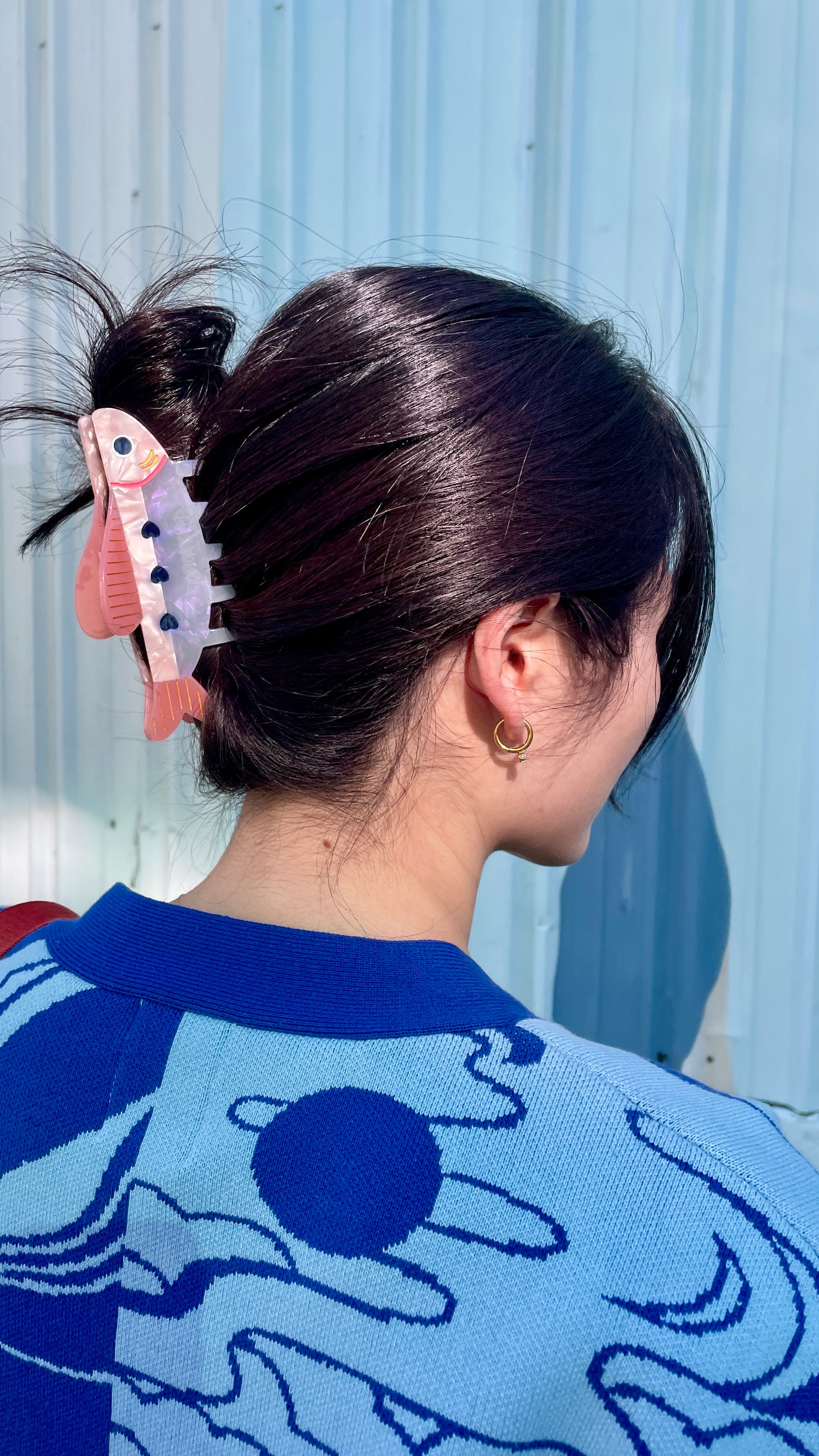 This claw clip features a pink and blue sardine that matches every outfit and will hold your hair in rain or shine!